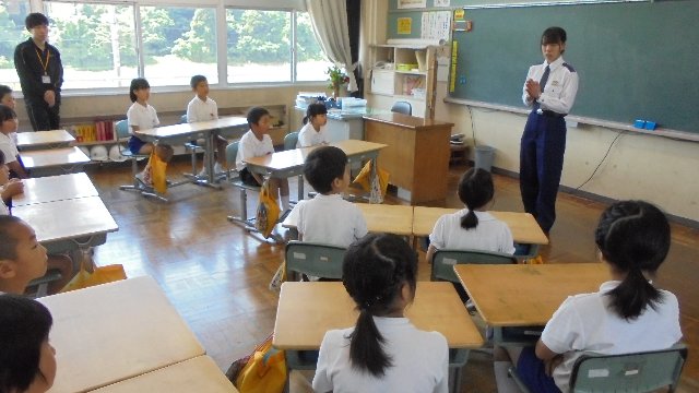 分かりやすく大きなボードを使って「いかのおすし」の合い言葉で教えていただきました。子ども達がきちんと合い言葉を覚えていたのでびっくり、そして写真を見て下さい、いつもの通り聞く姿勢も良かったので、またほめられました。さすが、大海っ子は当たり前の姿が素晴らしい。