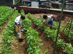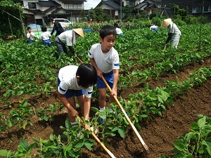 子どもたちは胸まである葉っぱをかき分けながらクワを上手に使って一生懸命土を寄せました。