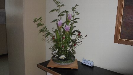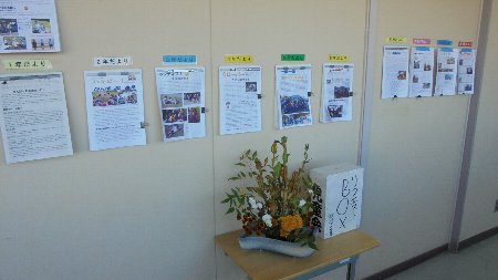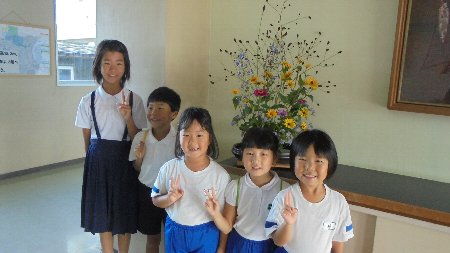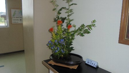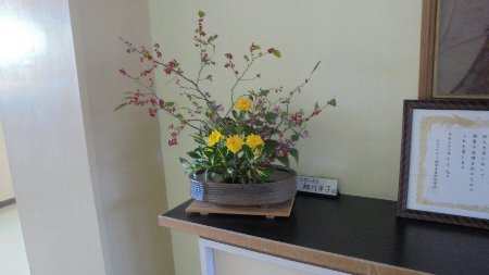 今週は、校外からたくさんのお客さんがおいでる研修会がありました。そこで活躍したのがボランティアさんの生け花でした。当日は会議室を華やかに、今日は、職員室前中央廊下を飾ってくれています。もちろんもうひとつ玄関にも。細川さん今週は2つ作って下さりありがとうございました。