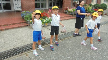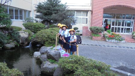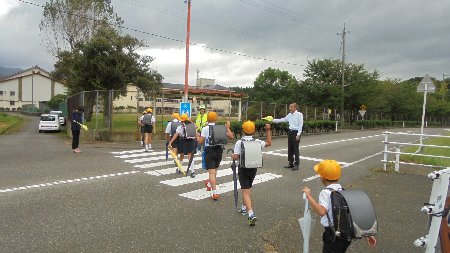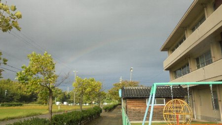 台風の被害はありませんでした。今日は良い天気になりそうです。今日から秋の交通安全運動です。登校指導に出かけるとき「にじ」を見ました。横断歩道では、市役所の職員の方が交通安全指導をしてくださっていました。ありがとうございます。