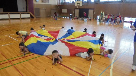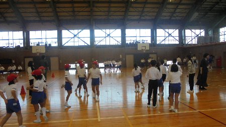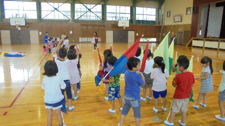 体育館で保育所の子どもたちが運動会の練習をしていました。土曜の小学校のお兄さんお姉さんが頑張った運動会を見に来ていた子がたくさんいます。園長さんに来年入学する年長さんのフラッグを見てほしいと言われました。とっても上手でした。