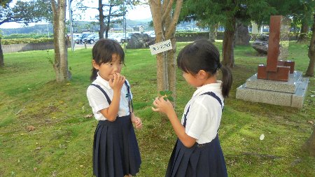 庭で遊んでいた4年生にキンモクセイのことを教えてあげました。においに関心を持ったので一枝折って渡しました。