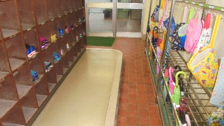 細川さん今週も花の生け替えありがとうございます。児童玄関は雨の日も整然としています。かかとがそろっているし、雨具かけもきちんとなっています。長靴が少ないのはなぜ?