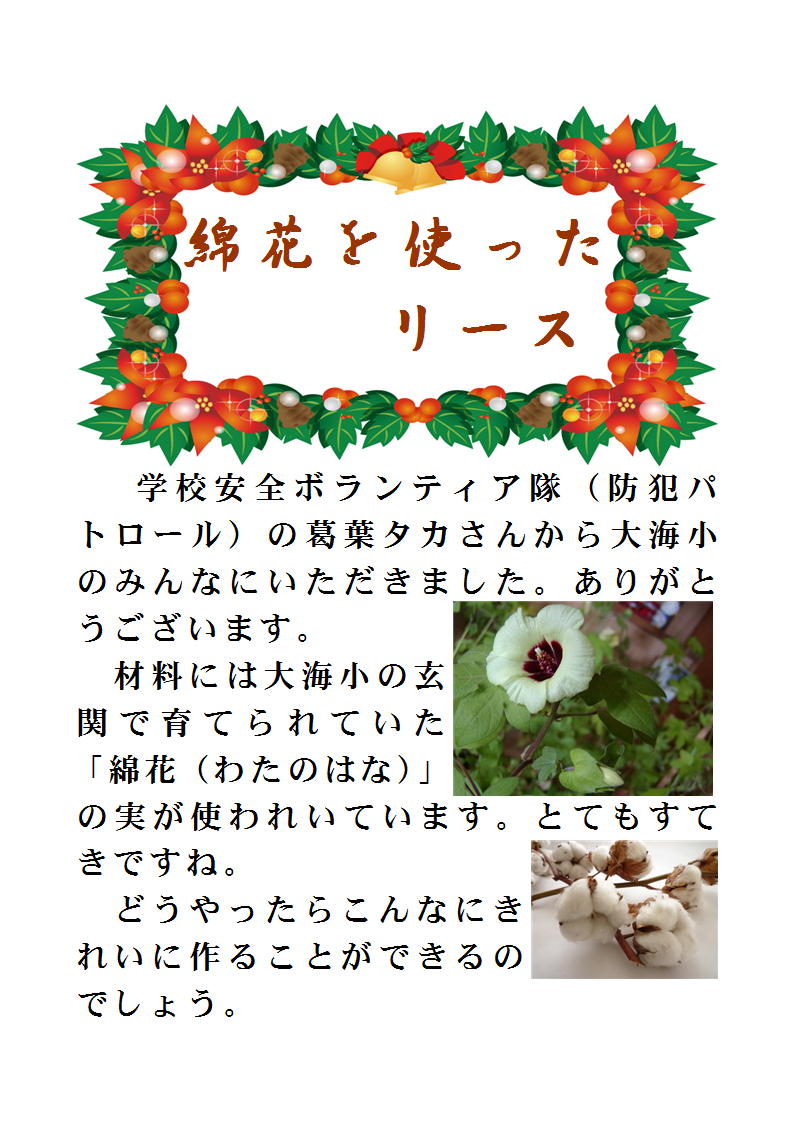 綿の実をあしらったリースの説明(掲示)です。