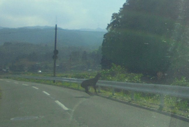 昨日の高学年遠足、宝達山へ向かう途中でのことです。子どもたちの目の前を大きな4つ足の動物が・・・道路の中央に出てきてこちらを見ています。しばらくすると道路脇の川の茂みに消えていきました。