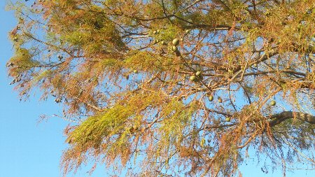 メタセコイアの大木がたくさん実をつけています。それと校庭の割合背が低い木に黄色い?みがいっぱいなっています。何という木なのでしょう、中には赤い種のようなものが・・・子どもたちと調べてみたいですね。