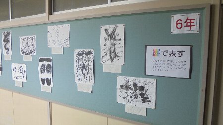 次は6年生の作品です。墨絵かな、渋い作品が並んでいます。来週の学校公開で直にご覧下さい。