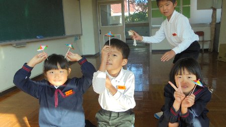 昨日の祖父母参観に使って下さいと道長さんからいろいろな形の紙飛行機、盛土さんからカラフルな色紙でこしらえたこまをいただきました。