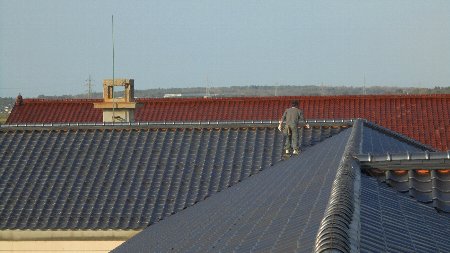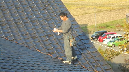 3階の屋根、足もすくむほどの高いところ、それも足が滑りそうな瓦の上をすいすいと・・・忍者ではありません(笑)