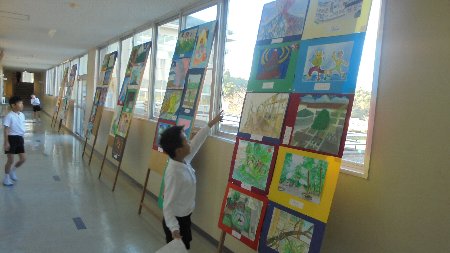 また、校内には子どもたちの図画などの作品が展示してありました。こちらもご覧いただけたでしょうか。ちょうど河北郡市図画展高学年の部の巡回展示もあり、職員室前に展示しました。本校からは、5年竹田さん、6年西野さん二人の作品が入っております。8日まで展示しますのでお見逃しの方はどうぞおいで下さい。