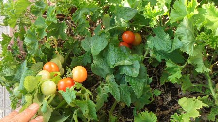 もうひとつ体育館前、ミニトマトががんばって実をつけています。ベゴニアの中で埋もれるように・・・十分甘さもあります。この季節に珍しくありませんか?こちらはつまんで食べていって下さい。