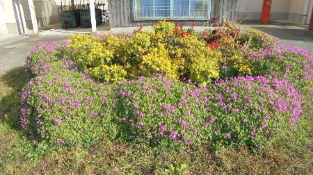 学校の外回りも冬支度、前庭の木々は雪釣りをする予定です。運動場側の花壇に目をやると・・・まだまだ花盛り、うれしい限りです。前庭のプランターもかたづけるにはもったいないです。ぎりぎりまで・・・でも春の花も準備しないと、板挟み(笑)