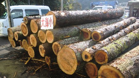 伐採した学校林の杉です。ここで静かに寝かせて、いろいろな処理をしてもらいます。