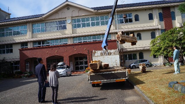 ついにベンチが森林組合から搬入されました。林PTA会長が学校開放でおいでたので、設置場所を相談しながら・・・。すぐにブルーシートで包み、子どもたちにはベンチに乗ったり触ったりしないように指導しました。