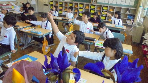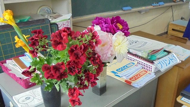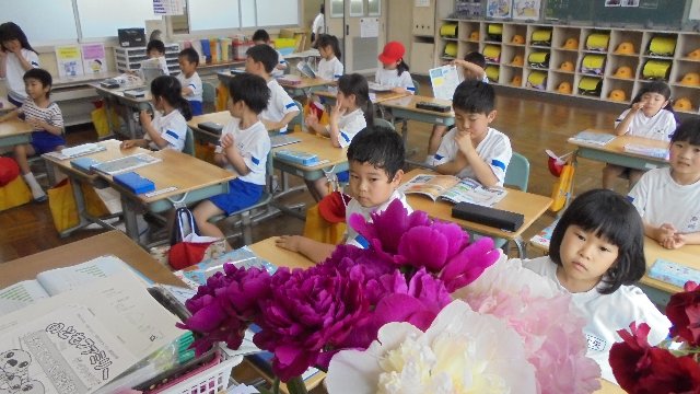 1年教室、こんなきれいな花が飾られていました。「なんていう花なの?」「ぼたん」という答えが返ってきました。こんな立派な花を切って持ってきてもらって、本当にありがとうございます。持ってきてくれた子は、写真の一番奥、見えるかな・・・次の日お家の人にお会いしたのでお礼を伝えました。シャクヤクの花だそうです。