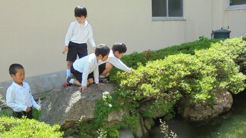 おーっと、落ちないでよ。池のカエルを見ようと石の上にあがっている子がいます。遊具広場は相変わらずの人気です。体育館のドッジボールも。