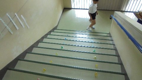 階段や廊下、いろいろなところに謎?の物・・・不思議な物がはられたり置かれたりしていました。ペットボトルのキャップや色水が入ったコップ、カラフルです。ここは21世紀美術館という雰囲気でした。