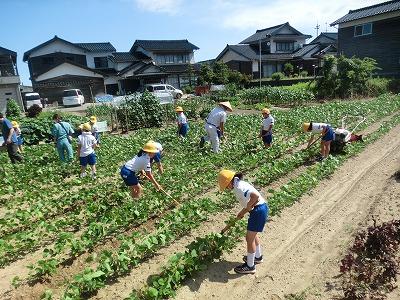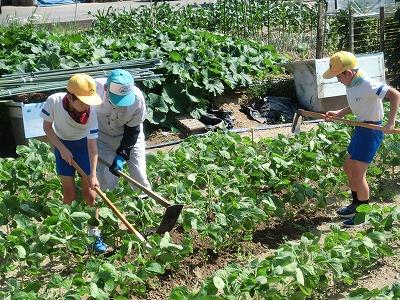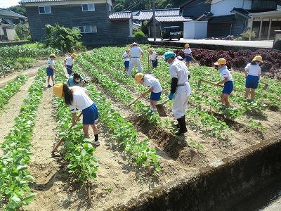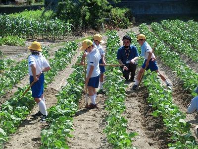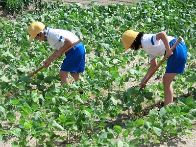 ☆3年生の様子 5月に植えた大豆の土寄せを髙崎さんの指導の下、行いました。慣れないくわの扱いに苦戦しながらどうにか土寄せを行うことができました。暑い中、ご苦労様でした。