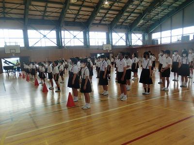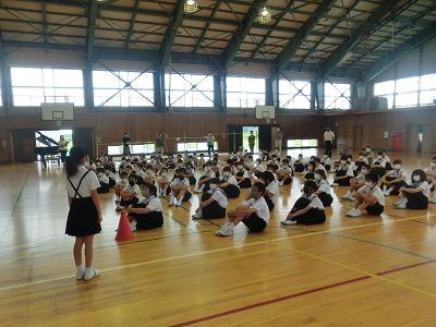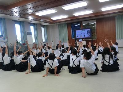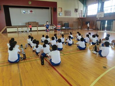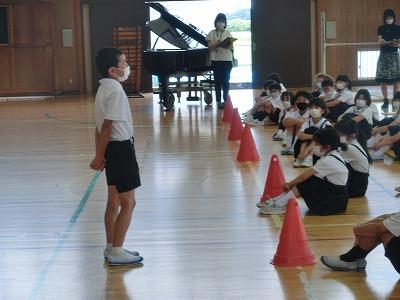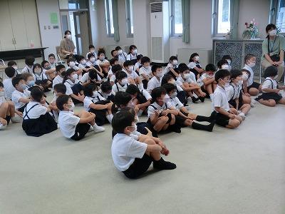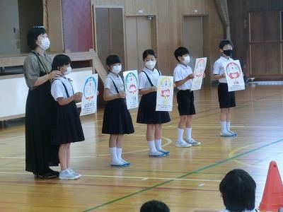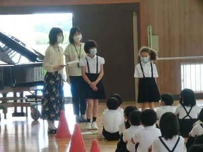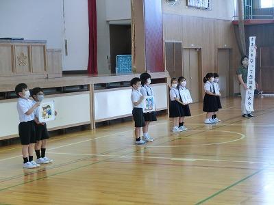 本日朝、7月の全校集会を行いました。校歌、話し方大会の表彰(宇野さん)、校長先生のお話、に続いて今日から今週いっぱい本校で体験入学をする姉妹を紹介しました。ドイツの学校に通っていて、今お休み中のため、日本の学校を体験してみたいということで、一週間の体験入学として受け入れました。子どもたちにとって、異文化体験ができるいい機会になると思います。その後、6月生活目標の振り返りを発表してもらい、7月の生活目標について1年生が発表しました。養護教諭の諸岡先生から、熱中症についての注意を聞き、今月の歌を歌って終わりました。