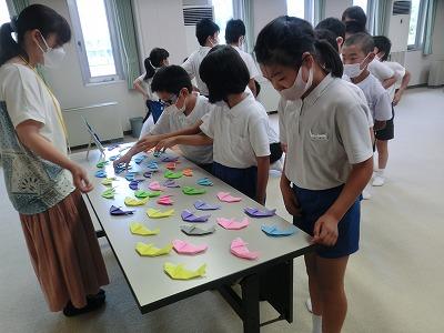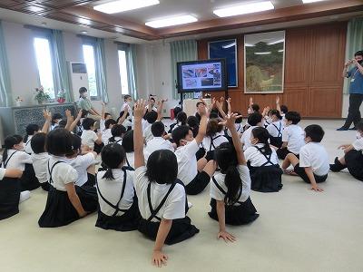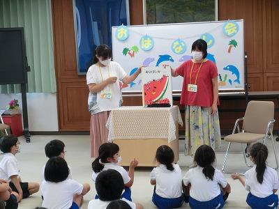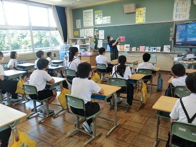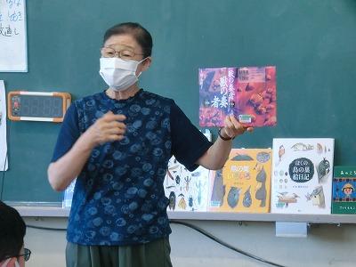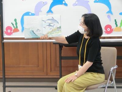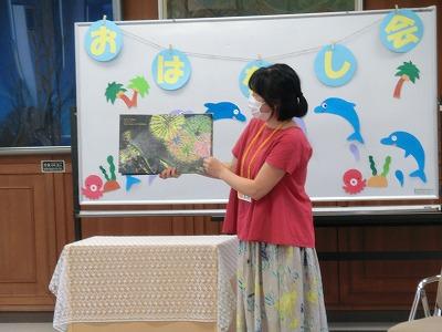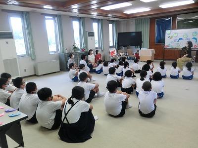 本日、昼休みに「ひみつのポッケ」さんによるお話会がありました。1~6年生まで約30人ほどの子どもたちが集まりました。夏らしいお話ということで、今回は「すいか」「花火」「いるか」を題材にした絵本を読んでいただきました。最後には、いるかの折り紙をもらって、みんな笑顔でした。