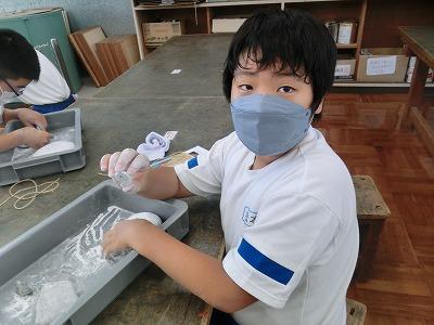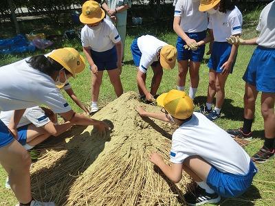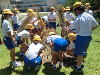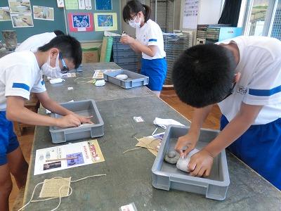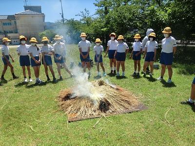 ☆6年生の様子 6年生は、先日の土器づくりの続きで、今回はいよいよ土器を焼いて完成させました。土器の上にわらをかぶせ、蒸し焼きになるようにわらに粘土を塗り固め、火をつけました。焼きあがるまでの時間を利用して、県埋蔵文化センターの出前講座を聞きました。縄文時代のお話と勾玉づくりでした。短時間でしたが、とても興味深い授業でした。