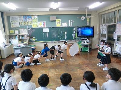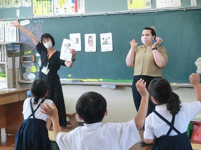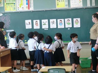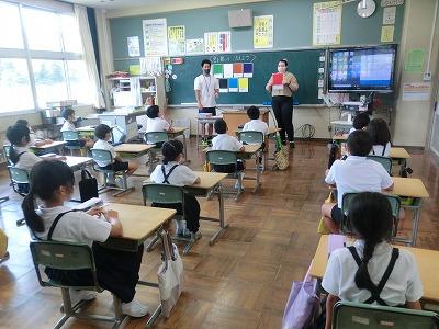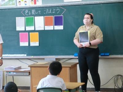 1学期も残り2週間となりました。暑い日が続きますが、今日も大海っ子は元気に頑張っています。1,2年生はローラ先生と外国語活動を行いました。1年生は、今の気分を応えていました。「あいむ はっぴぃ」「あいむ はんぐりー」と元気よく応えていました。2年生は「色」を応える練習をしていました。「れっど」「いえろー」とこちらもとても元気に応えていました。