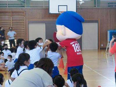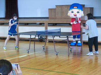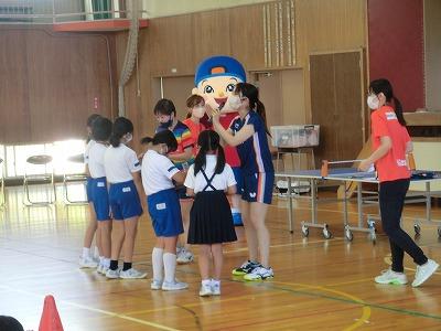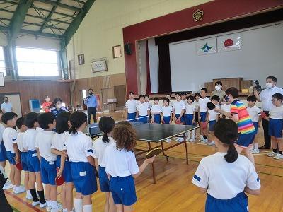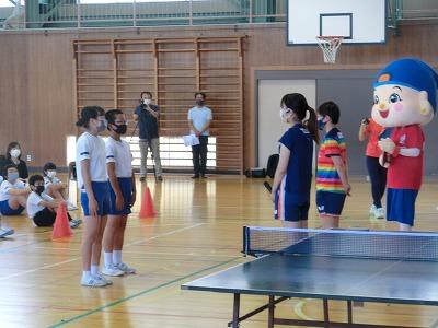 本日、日本ペイント様から寄贈いただいた卓球台の贈呈式が行われました。本来ならば、昨年度行う予定でしたが、新型コロナウィルス感染拡大防止の観点から延期されていました。贈呈式は、日本ペイントマレッツの自己紹介から始まり、学校長のお礼の言葉、記念品の贈呈と続き、その後、マレッツについての〇×クイズで盛り上がりました。最後に全員で記念撮影を行い、セレモニーは終了しました。その後、3~6年生が卓球教室に参加しました。最初は慣れないスポーツに戸惑っていましたが、徐々に慣れてくると笑顔がたくさん見られるようになりました。最後の振り返りでは、「これから卓球をしてみたい」と意欲を見せる子も出てきました。とても有意義な時間になりました。