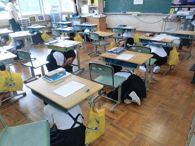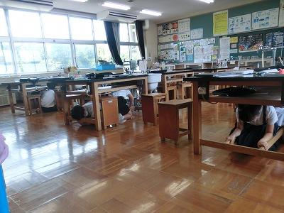 ☆本日は、全県一斉に地震による避難訓練を行う「シェイクアウトいしかわ」の日です。放送による指示に従って机の下に隠れる訓練を行いました。今日は隠れるところまでの訓練として実施しました。
