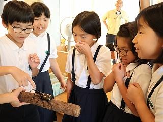 昆虫館では、職員の方から昆虫の体の仕組みについてのお話等を聞き、その後、館内を自由に見学しました。理科の学習以上に、昆虫と触れ合い、くわしく知ることができました。