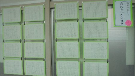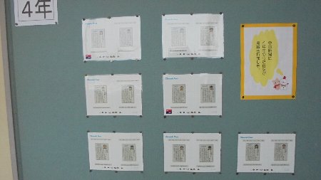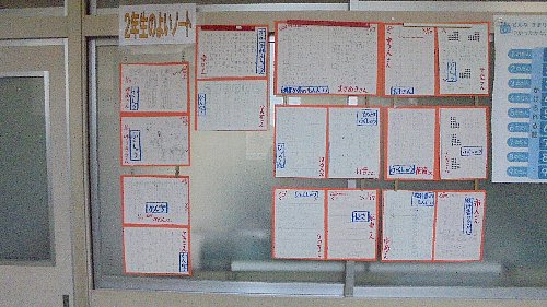 写真は1年生の掲示板です。「校長先生へのお手紙」というタイトルで作文してあります。自分の思いを文字に、とっても上手に書けています。お見逃し無く。