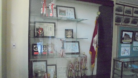 体育館に通じる廊下の曲がり角にある立派な陳列ケース。しばらく入れ替えがなくほこりにまみれていました。いろいろな表彰に関わるものが飾られていますが、10年20年前のものがいっぱい。学校表彰だけでなく地域の表彰、公民館やスポーツ少年団のものがかなり見受けられました。
