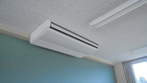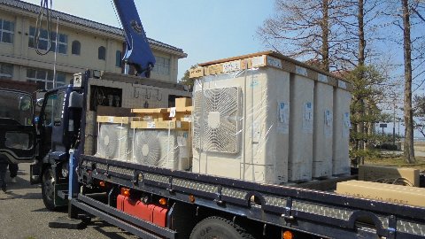 今日は大海小にたくさんのトラックがやってきました。積み荷はエアコンの本体です。安全のため子ども達が登校を始める前に校内に運び込みます。大きな機械がクレーンにつり上げられ次々と運び込まれました。
