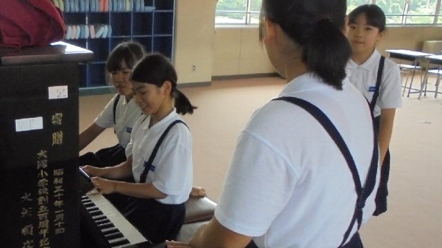 今日紹介するのは書き方毛筆の時間の一場面です。書き方は黙々と紙に向かって時を書く場面が多い教科ですが、大海小ではこんなときもよく考えさえ、主体的な発表や学び合いを促しています。写真のように進んで手を上げて発言し、話し手に向いてしっかり聞けています。