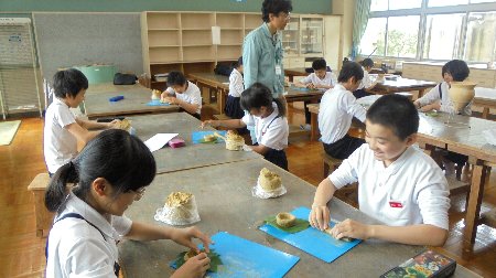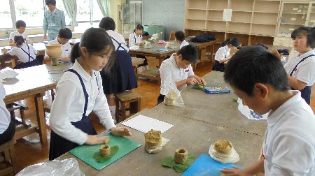 6年生が、土器づくりの体験をしました。社会で学習した弥生時代の人になった気分で葉っぱの上に粘土を積み上げ土器を完成させました。指導は市教育委員会の油井さんです。丁寧にいろいろ教えてくださってありがとうございました。