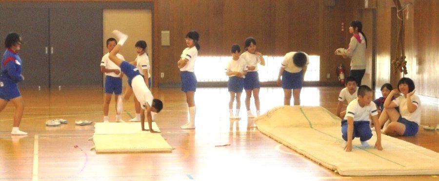 先週から4年生が、鉄棒運動、跳び箱運動、マット運動の練習をしています。授業時間や放課後に練習しています。できない技やむずかしい技ができるようにがんばっています。30日には校内発表、来月の1日には、宇ノ気小学校で市内6小学校の4年生が集まり、交歓会が行われます。励まし、応援よろしくお願いします。