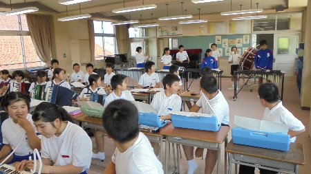 日に日に上手になっています。さらなる上達を目指して特別講師をお招きしました。高松中学校、ブラスバンド顧問の吉本先生です。先生はこれまで数々のコンクールで優勝を修めてきたすばらしい指導者です。みんなやや緊張気味でした。今日一日ですごくうまくなったこと間違いなしです。