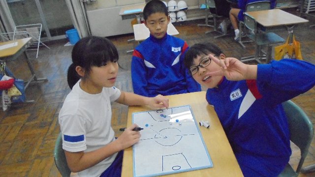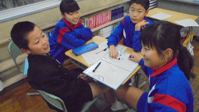 5年生は、体育でバスケットボールをしています。この日の朝は、朝学習の時間を使って1限目のバスケの試合について作戦を練っていました。チームワークがいいですね。