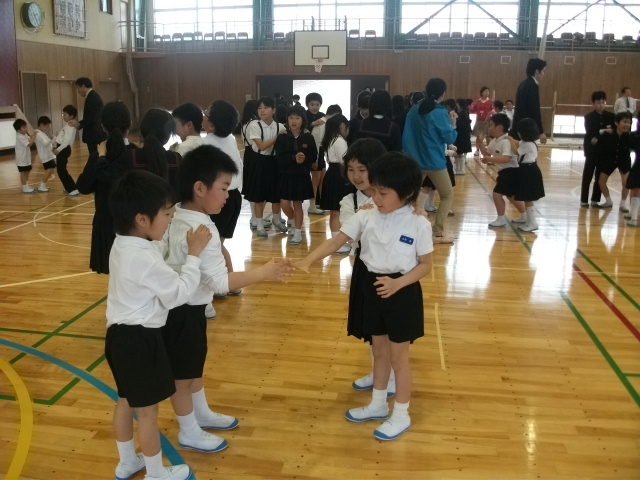 一年生を迎える会がありました。ステージの上で1年生がマイクを持って自己紹介をしました。その後、全校児童で○×クイズやじゃんけん列車をして楽しみました。1年生は○×クイズで正解すると嬉しさを体いっぱいに表現してとび上がって喜んでいました。