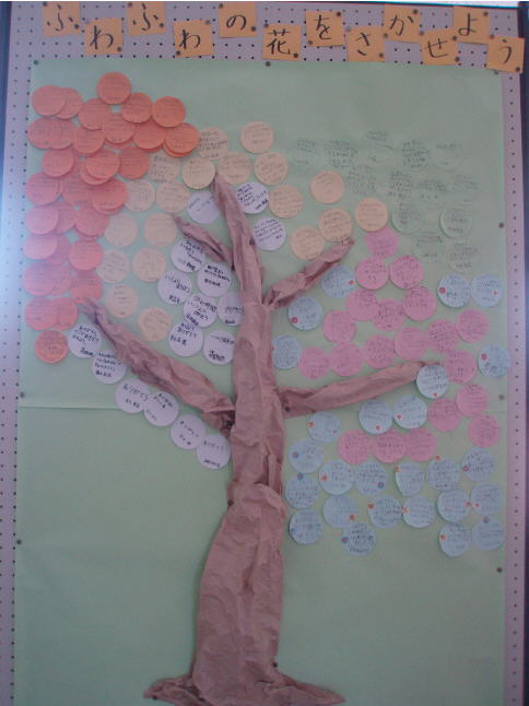 さて、学校では、児童玄関に「ふわふわの花を咲かせよう」を掲示しています。自分で、よい言葉を遣ったと思ったら、花をつけていきます。だいぶ花が咲きました。取り組みは今日で終わりになりますが、これからも気持ちのよい言葉遣いをつかうよう働きかけていきます。家庭でも、良い言葉遣いは、いっぱい褒めてあげてください。
