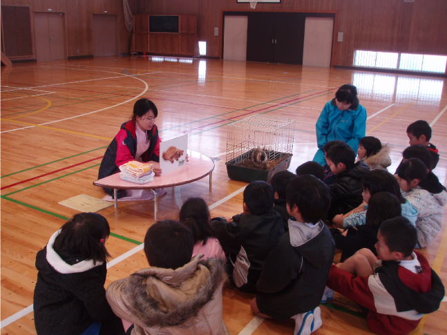 5限目、1年生対象に動物ふれあい教室がありました。河北郡市内の獣医さんが2人も来て、人間と動物の似ているところや動物に対しての接し方などを教えて頂きました。