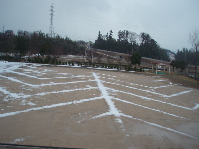 学校の運動場は、雪が降ってだんだん解けてくるときれいな模様が浮き上がります。きっと、暗きょが通っているところが水浸しにならないので、雪が残るのでしょうね。下の写真をご覧いただけると、その内容が分かると思います。