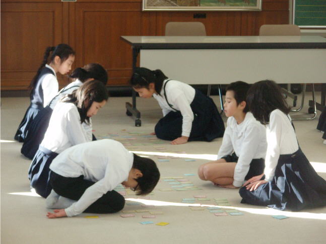 給食後の5時間目に4年生は、「百人一首大会」を行いました。会議室で、先生が上の句を詠むと、「はいっ」と言う声と一緒に手がさっと伸びて札を押さえる音も響きました。しーんとした緊張感の中、一人ひとりの真剣さが伝わってきました。