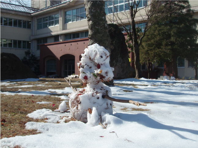 先日、うっすらとつもった雪を何とか転がして雪だるまを作っていました。それも、この良い天気で汗を流したように雪が水になって解けていきます。子ども達が遊んだ後の雪だるまをご覧下さい。ちょっとかわいらしい雪だるまです。