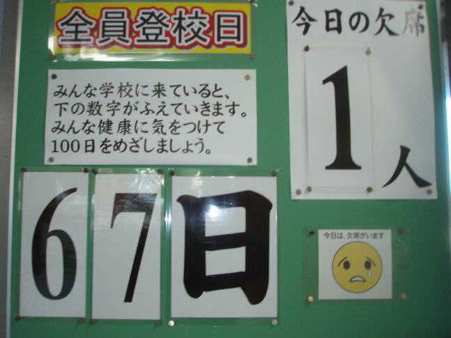 さて、4月から163日授業日数がありましたが、今まで全員学校に来ていた日数は67日です。年間100日を目標にしていましたが、ちょっと難しくなってきました。でも、これほど揃うことは他の学校にはほとんどあり得ないことだと思います。保護者の皆様、毎日児童の健康管理としっかりと学校に送り出してくださり有り難うございます。3月末まであと30数日ですが、体調管理を十分にして、欠席しないようお互いに気をつけましょう。