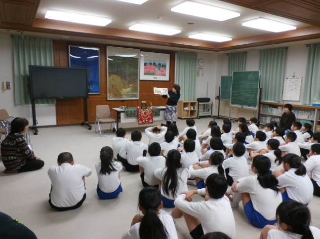 変則的ですが、今回の読み聞かせは1・3・5年生対象でした。最初は、歌を歌いながら手遊びをしました。「♪桃太郎さん、桃太郎さん・・・」数字が出てきたら、指で数を作ります。例えば、桃太郎さんのさんで数字の3を示します。きびだんごのごで数字の5を表します。どの学年も楽しそうに歌いながら体を動かしていました。その後、「干支のはじまり」という本を読んでもらいました。「その本、うちにある。」「保育園の時に読んでもらった。」など言っていましたが、本の読み聞かせ会、やまんばさんの人が読み始めると、真剣に聞き入っていました。昔と比べて子ども達は楽しみがいっぱいあるので、読書量が減ってきていると言われています。最終的には、読書の楽しみを自分で味わってほしいですね。