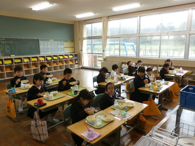 1年生は、給食の時間が大好きです。給食の準備もみんなで協力し、ゆっくりと食べる時間があります。「今日の給食は、美味しいですか?」と尋ねると「美味しい!」と大きな声で応えてくれました。給食が多すぎて辛いという子がたいていいますが、今のところみんな食欲旺盛で大丈夫です。好き嫌いなく食べて、健康な体で学校生活を送ってほしいと思います。