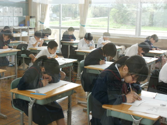 小学6年を対象とした全国学力調査(全国学力テスト)を実施しました。今年は国語と算数に理科を加えた3教科の学力を調べます。2限目に廊下から児童の真剣な顔を見ることができました。ぴりっとした雰囲気が窓越しから伝わってきました。結果発表は8月下旬になると思います。大海小学校の結果は、ホームページで公表します。