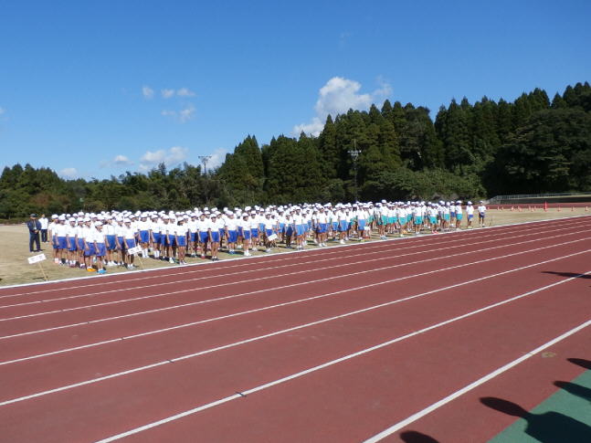 すっきりと晴れ渡った秋空の下、全員が100m走、選択種目(走り高跳び、走り幅跳び、ロケットボール投げ、800m走)、そして、各クラス代表8名によるリレーが行われました。本格的な陸上競技場で走るのが初めてとあっていろいろとハプニングもありました。走っている途中に両足のシューズが抜け靴下でゴールした子やコースを真っ直ぐに走ることができなくて、ゴールでは違うレーンに入ったために計時できなく記録を取り直しになった子もいました。800m走では、最後の直線で疲れ、顔をゆがめて走る子どもに会場から拍手が起こり、とても良い大会でした。他校とふれあうこともでき、有意義な大会になりました。