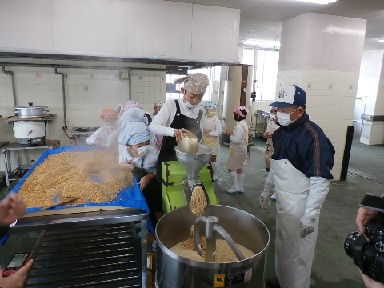 今年は学校で味噌づくりをしました。約2時間大豆を蒸した後、大豆を冷ますためにしばらく広げておきました。冷ますと、味噌の色がきれいになります。その豆を細かく砕いてミキサーにかけて、大きな金属の入れ物に入ります。入れ物には、予め麹と塩が入っていますので、つぶれた大豆を麹と塩と一緒に混ぜます。そして、十分に混ぜ合わせると味噌の元(まだ熟成していない)ができます。後は、温度が高くなり、夏を越すと美味しい味噌が出来上がります。来年の秋には、今の3年生に配ることができます。お楽しみに!!