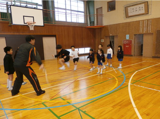 昼休みに全校体育館に集まり、それぞれの学年で8の字跳びをしました。3分間で飛べる回数を数えました。今回は高学年はちょっと調子が悪くて、3,4年生が良い成績でした。3年生は264回、4年生は260回飛ぶことができました。約20分の運動でしたが、汗をかいている児童がいました。冬の良い健康づくりになりました。